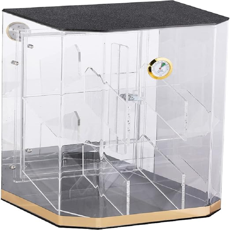 这款雪茄展示架设有两层倾斜搁板,每层搁板上配备三个固定隔板,共形成六个储物空间。它还内置黄铜湿度计、加湿器,以及带锁的后部检修门。 这款亚克力雪茄保湿展示柜设计轻巧,透明美观,价格更是令人难以置信,是您的理想之选。