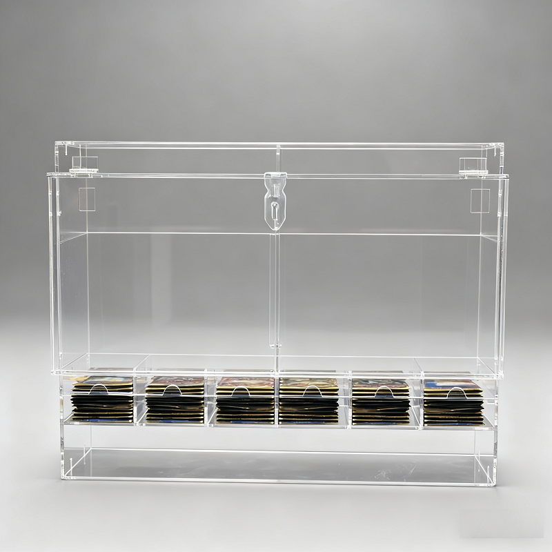 游戏店亚克力 TCG 卡牌展示架:专为游戏店打造,多层设计可同时展示多款 TCG 卡牌,高透亚克力材质凸显卡牌质感,自动分发功能方便店员补货,提升顾客体验。