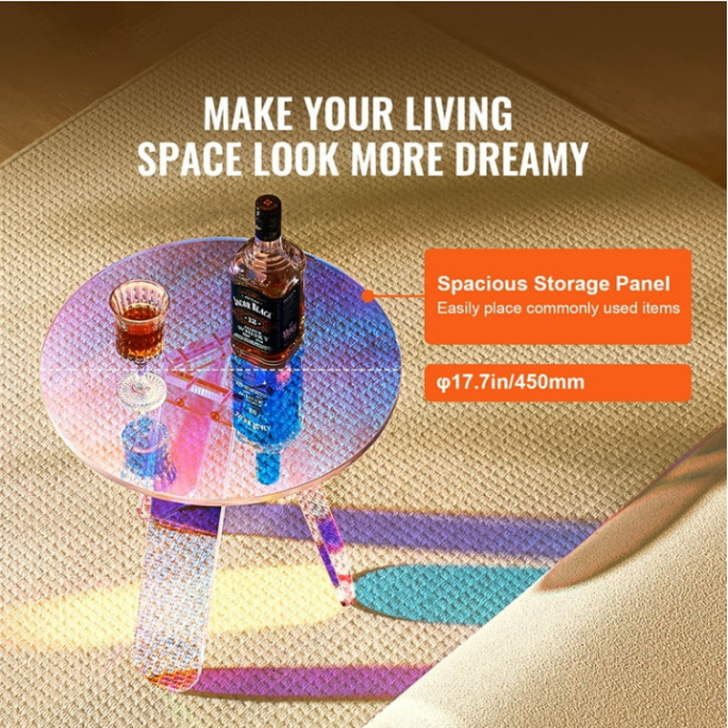 华丽梦幻的设计:体验我们这款圆形虹彩边桌的迷人魅力,它会根据角度和观察者的位置折射出不同的光线颜色,为您的房间营造出梦幻般的氛围。