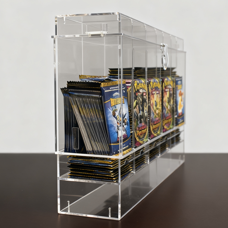 游戏店亚克力 TCG 卡牌展示架:专为游戏店打造,多层设计可同时展示多款 TCG 卡牌,高透亚克力材质凸显卡牌质感,自动分发功能方便店员补货,提升顾客体验。