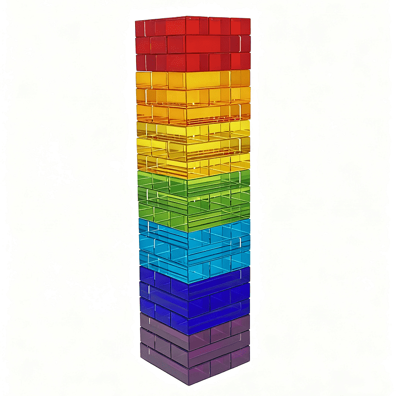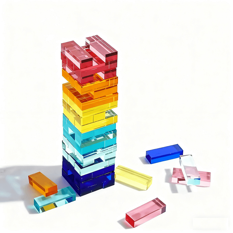 亚克力叠叠乐是一款由高透明度、坚固耐用的亚克力材质制成的经典桌面益智游戏,它通常由多根细长的亚克力棒堆叠而成