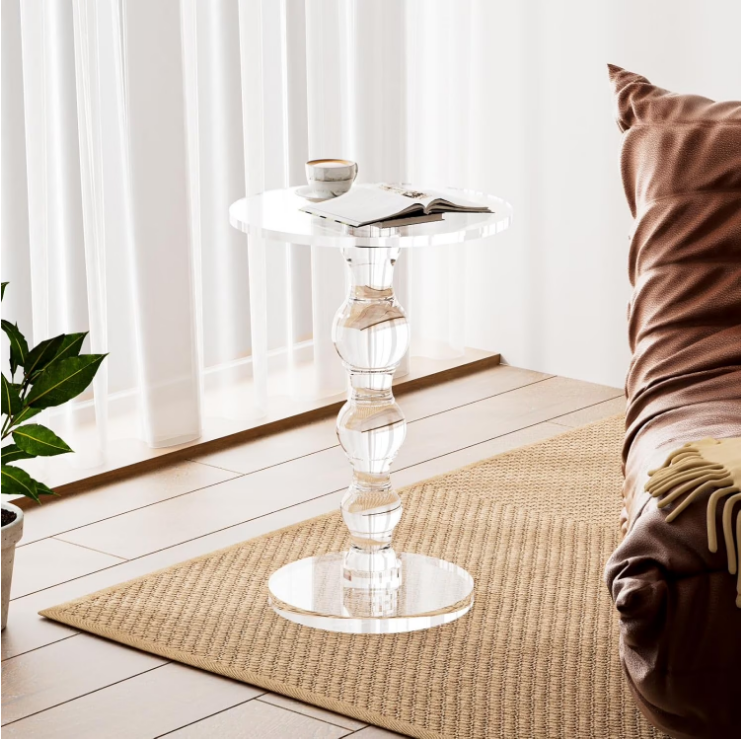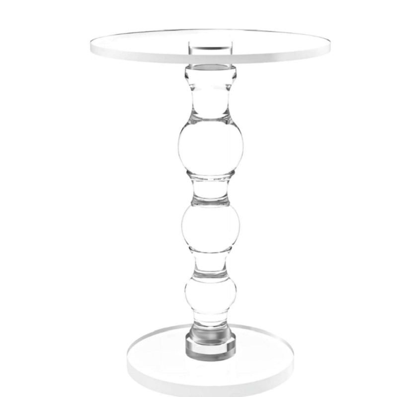 This acrylic round side table with one golden metal leg with hemisphere base structure, transparent acrylic tabletop, easy matching with most style of interior decoration, fits for living room, bedroom, office, bar and so on.