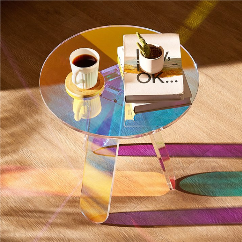 华丽梦幻的设计:体验我们这款圆形虹彩边桌的迷人魅力,它会根据角度和观察者的位置折射出不同的光线颜色,为您的房间营造出梦幻般的氛围。