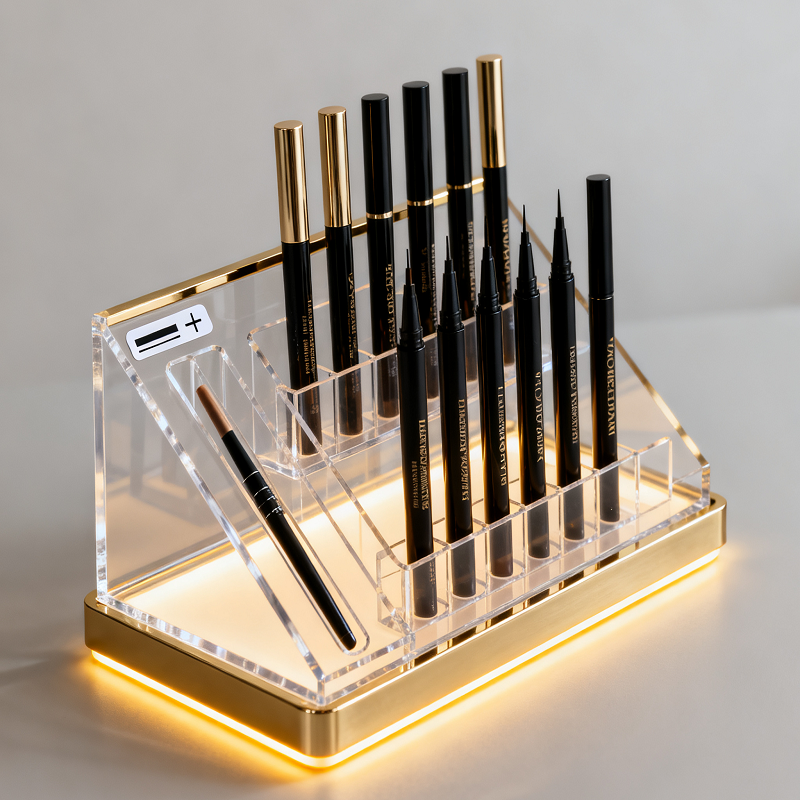带有品牌标识的定制桌面亚克力眼线笔和睫毛膏展示架,适用于美容店使用